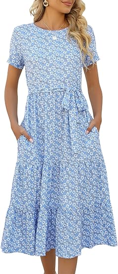 Lyrur Women's Dresses Casual Summer Tiered Midi Dress Short Sleeve Belted Ruffle Babydoll Boho Sundress with Pockets