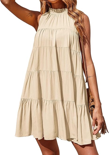Okiwam Women Summer Casual 2024 Sleeveless Halter Dress Ruffle Flowy Boho Sun Dress Loose Swing Pleated Cocktail Mini Dress