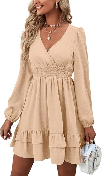 Rooscier Women's Wrap V Neck Swing Ruffle Swiss Dots Long Sleeve Mini Dress