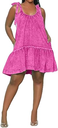 Women Denim Cami Dress Tie Shoulder Ruffle Hem Short Dresses Babydoll Wash Jean Sundress with Pocket