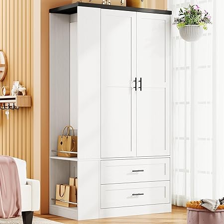 LIKIMIO Armoire Wardrobe Closet with Large Mirror, Storage Cabinet with 2 Doors and 2 Drawers, 2 Storage Shelves, 70" Wardrobe Cabinet for Bedroom, White