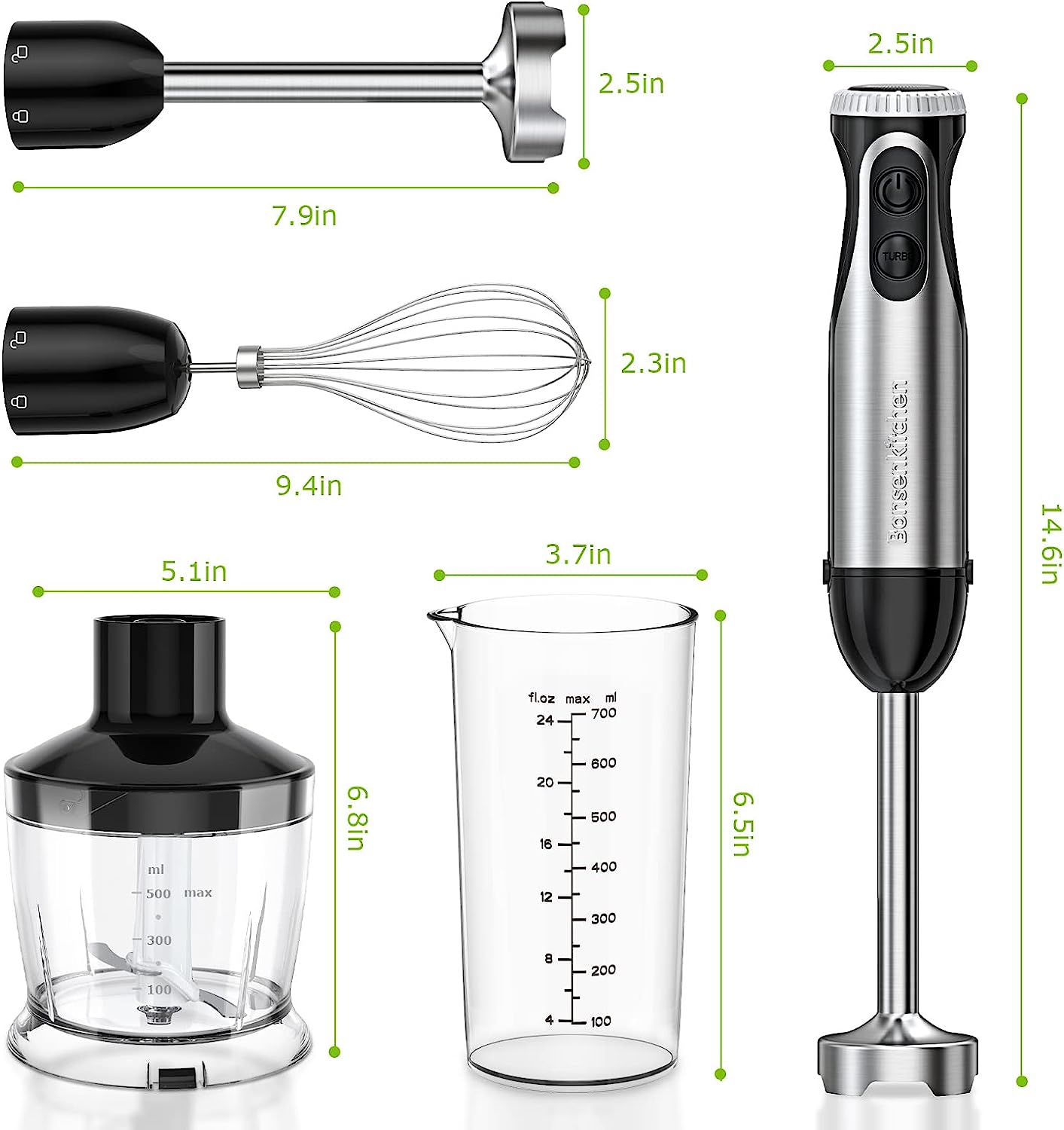 • 【4-in-1 Immersion Hand Blender】 Our handheld stick blender contains food blender, egg whisk, 24oz Beaker and 17oz food chopper bowl. Be your great assistant in kitchen - protein shakes, soups, mayonnaise, sauces, salsa, smoothies, whipped cream, food processing will be much more easier.