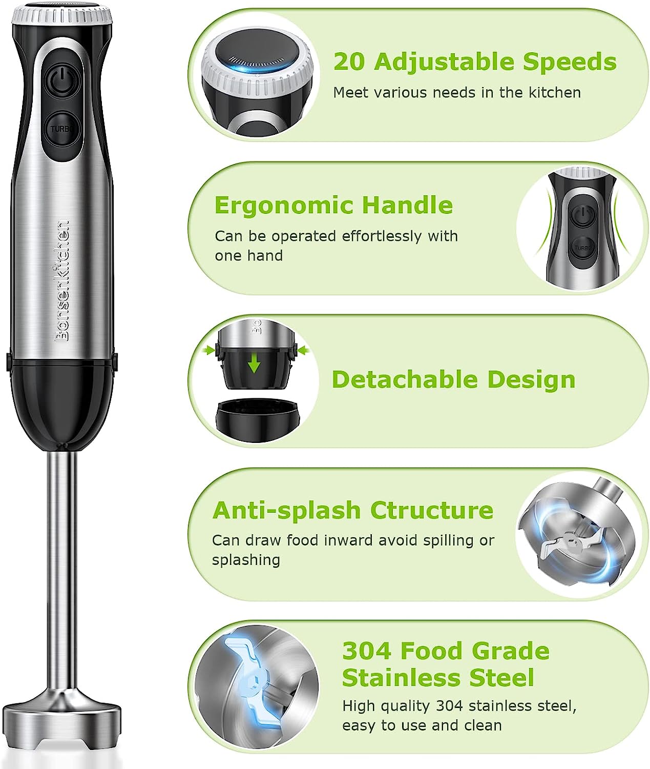 Bonsenkitchen Immersion Blender, 20 Variable Speeds & Turbo, 4-In-1 Stainless Steel Handheld Blender Stick Mixer with Egg Whisk, Beaker & Chopper Bowl