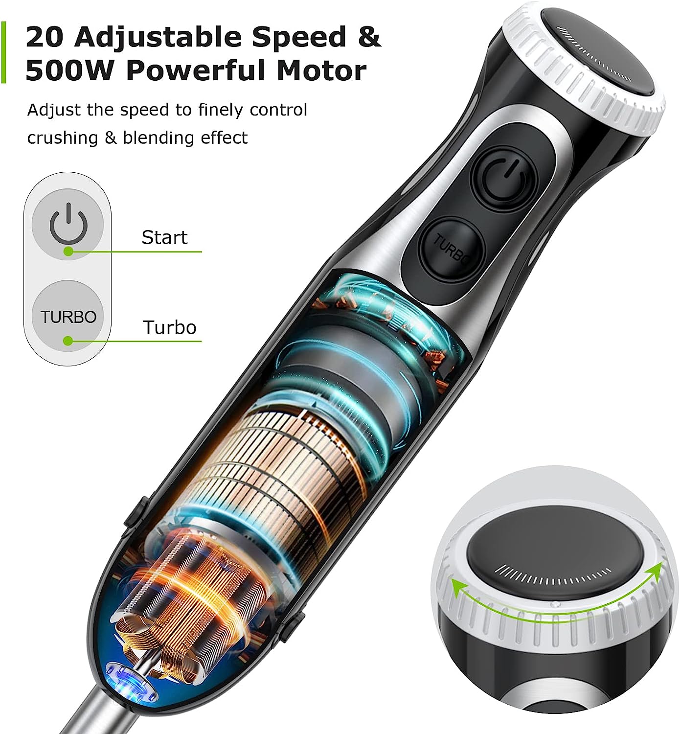 • 【Power & Fast】Equipped with an enhanced 500 Watt high-torque power motor + turbo blending, this immersion blender can handle more blending tasks and easily make smoothies, milk shakes, soups, puree or baby food. We also offer a 12-month exchange or money-back guarantee.