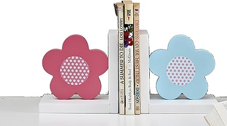 Wood Nursery Room Decorative Bookends Pink Flower/Guitar/AZ/Cupcake Bookends Baby Kids Gift Idea (Pink Blue Flower)