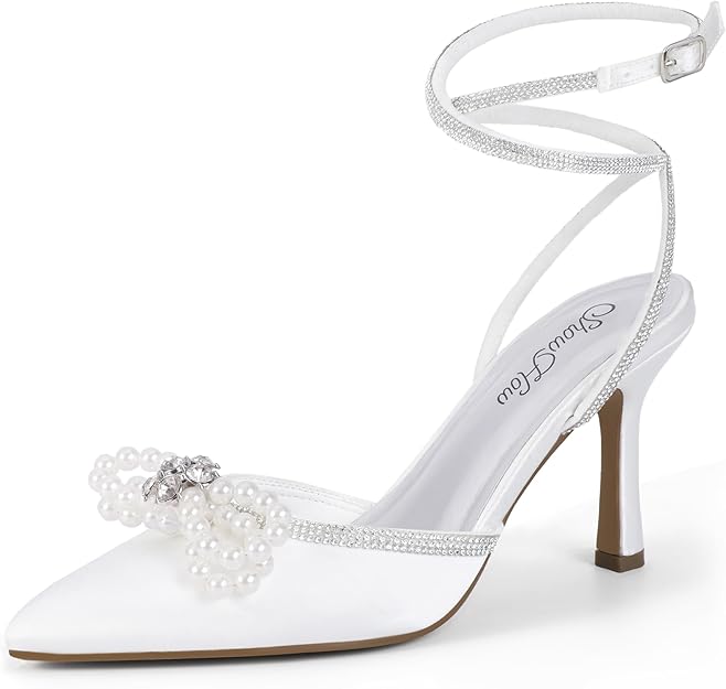 Mofri ShowHow Womens Wedding High Heels Slingback Stiletto Heels Closed Pointed Toe Strappy Heels Ankle Strap Pumps Rhinestone Pearl Bow Heels Bridal Party Wedding Dress Shoes