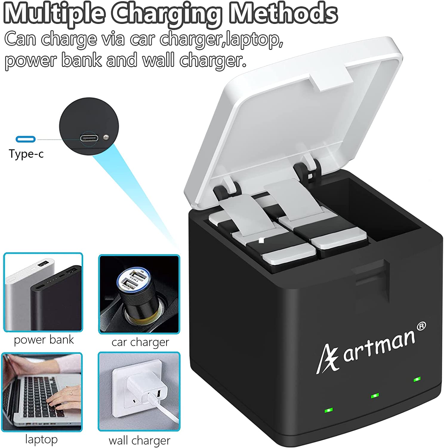 Artman Enduro Battery 2-Pack and 3-Channel Charger Compatible with GoPro Hero 11 Black/Hero 10 Black/Hero 9 Black (1800mAh)