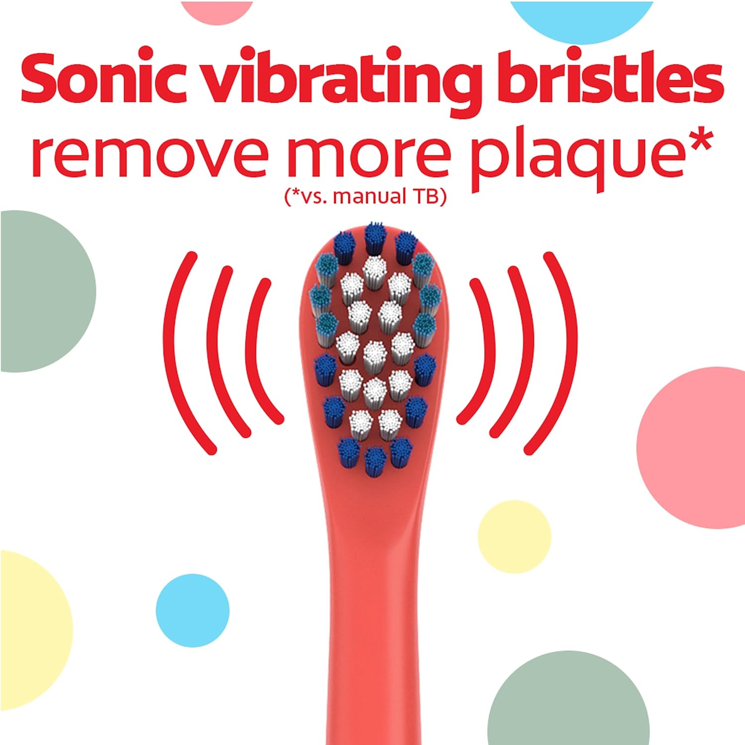• This Colgate battery powered toothbrush for kids has a small, vibrating brush head with extra soft bristles that cleans teeth and sweeps away plaque