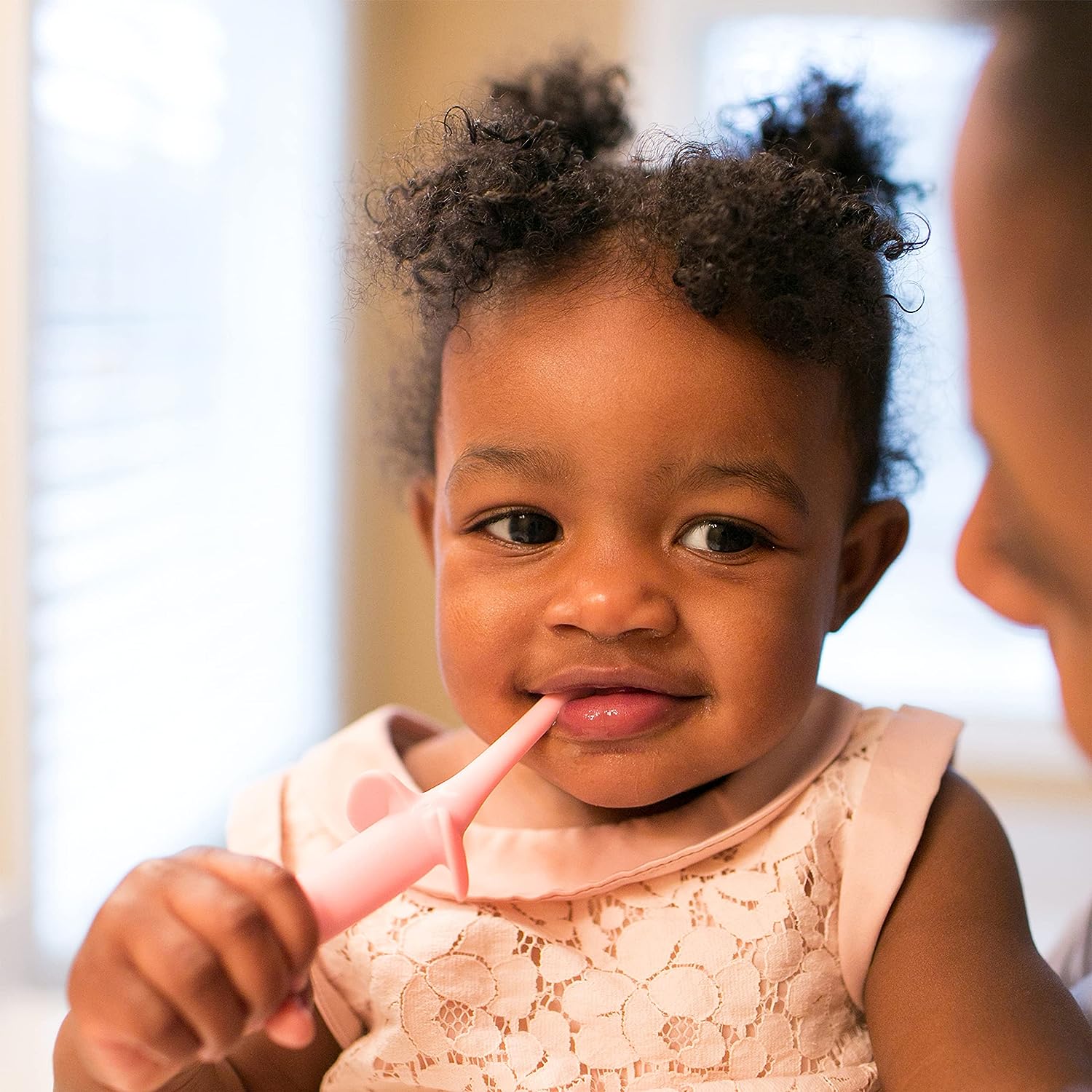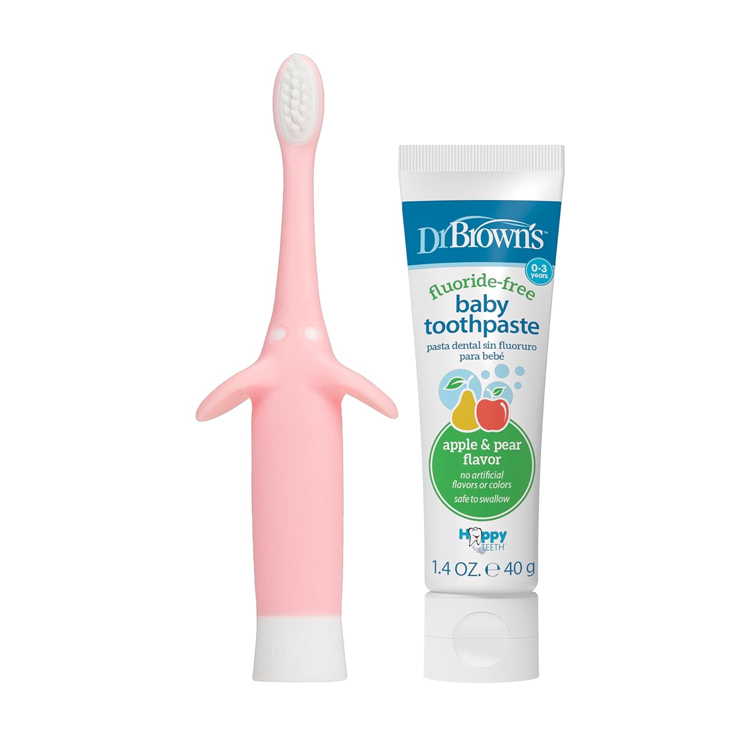 Dr. Brown's Infant-to-Toddler Training Toothbrush Set, Pink Elephant with Fluoride-Free Apple Pear Baby Toothpaste, 0-3 years