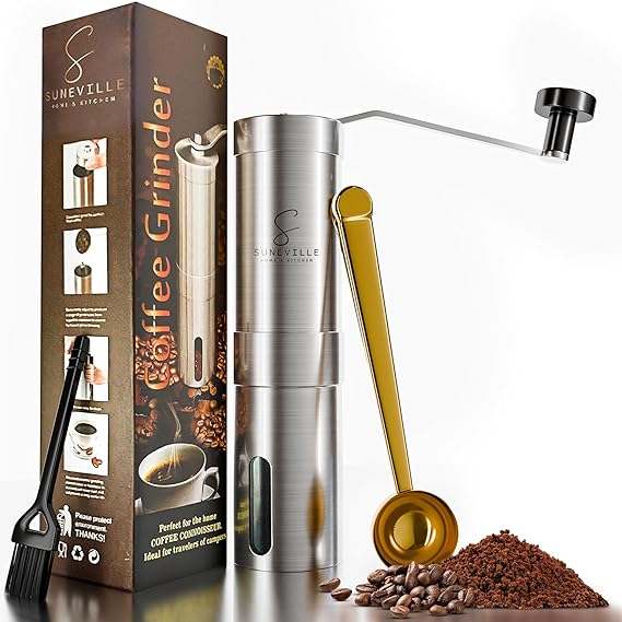 Manual Stainless Steel Coffee Grinder & Coffee Maker Accessories - Fine to Coarse Grinding Settings - Espresso Tools with Portable Hand Coffee Grinder, Golden Clipper Spoon & Black Brush