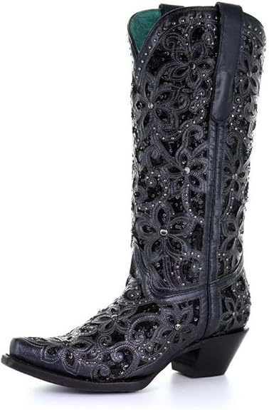 CORRAL LADIE'S BLACK INLAY & EMBROIDERY & STUDS, SNIP TOE, LEATHER SOLE, WESTERN, A3752