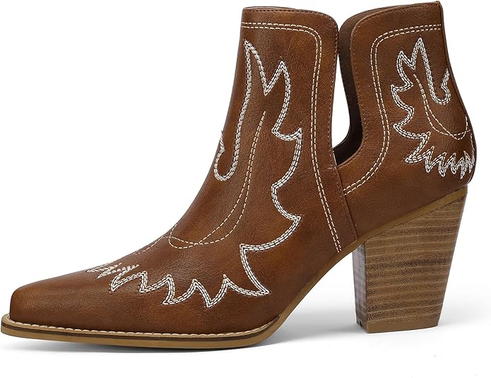 Cowboy Boots for Women Pointed Toe Embroidered Pull-on Cowgirl Boots Chunky Block Heels Western Ankle Booties