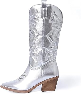 Mattiventon Cowboy Boots for Women Metallic Embroidered Cowgirl Mid Calf Boots Western Sparkly Cowboy Boots