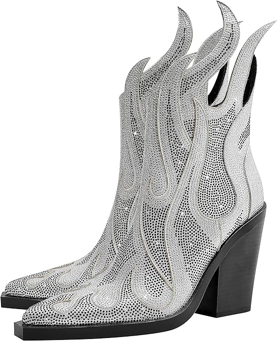 Women's Rhinestone Flame Pointed Toe Block Chunky Heeled Boots Fashion Sparkly Cowboy Ankle Booties