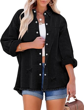 LookbookStore Womens Denim Jacket Oversized Button Down Shirts Jean Shacket Distressed Frayed Coat
