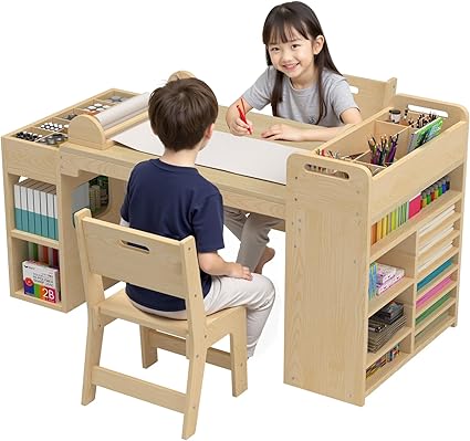 Kids Art Table and Chair Set with Paper Roll Dispenser, Kids Craft Table with Portable Art Supply Organizer for 4-12 Year Old, Drawing Table with Large Storage Desk for Kids, 50.4inx 24in-50B