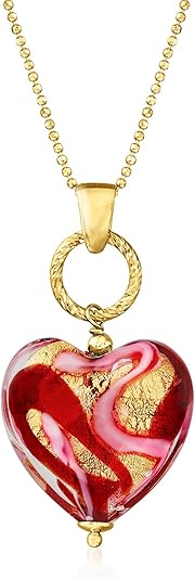Ross-Simons Italian Red and Pink Murano Glass Heart Necklace in 18kt Gold Over Sterling. 18 inches