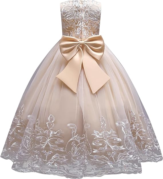 Flower Girl Lace Dress for Kids Wedding Bridesmaid Pageant Party Formal Long Gown Princess Communion Tulle Bow Dresses