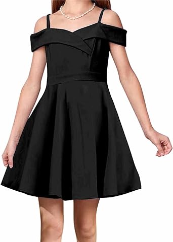 Girls Elegant Princess Cold Shoulder Fold Pleated High Waist Flared A Line Party Dresses, 8-12 Years