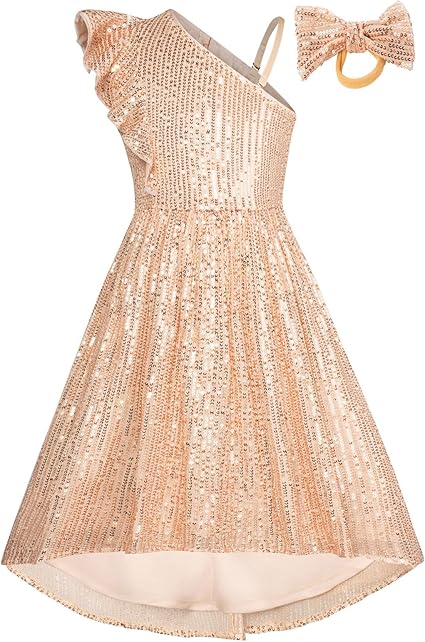 GRACE KARIN Girls One Shoulder Sequin Party Dress Girls Glitter Princess Midi Dress for Formal Occasion (5-12Y)