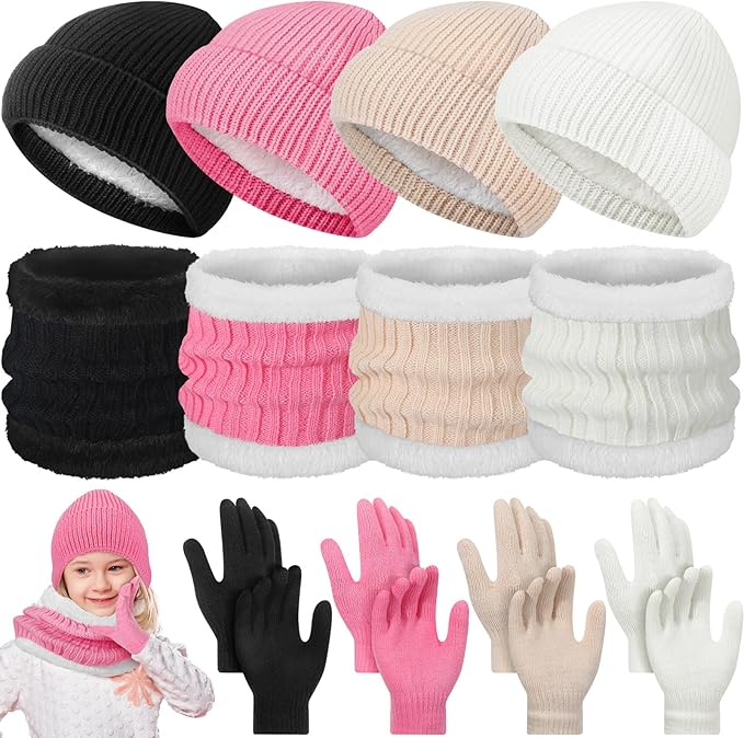 12 Pcs Kids Beanie Hat Gloves Scarf Set Winter Knitted Hat Ski Mittens Gloves Neck Warm Scarves for 5-8 Boys Girl Gift