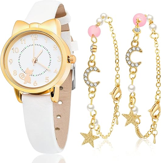 Hicarer 3 Pieces Kids Watch and Star Bracelet Children Quartz Watches, Including Cute Cat Pattern Watches Leather Quartz Watches 2 Pcs Beaded Chain Bracelets for Children's Day Graduation(White)