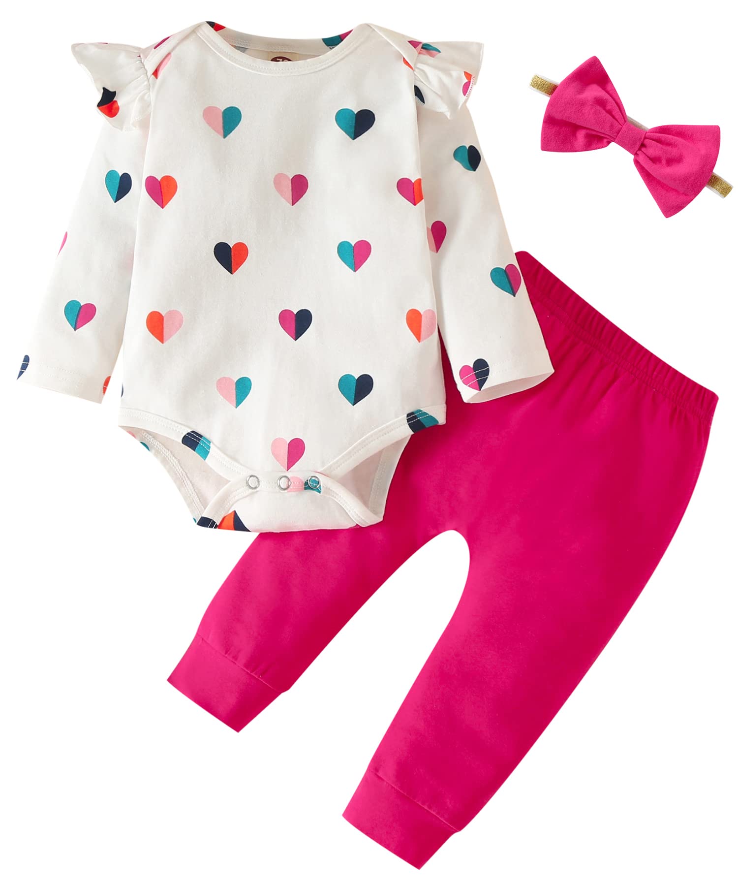 Fullfamous Baby Girl Clothes Gifts Outfits,Fall Winter Long Sleeve Romper and Pant Set Raspberry Heart 6-12 months