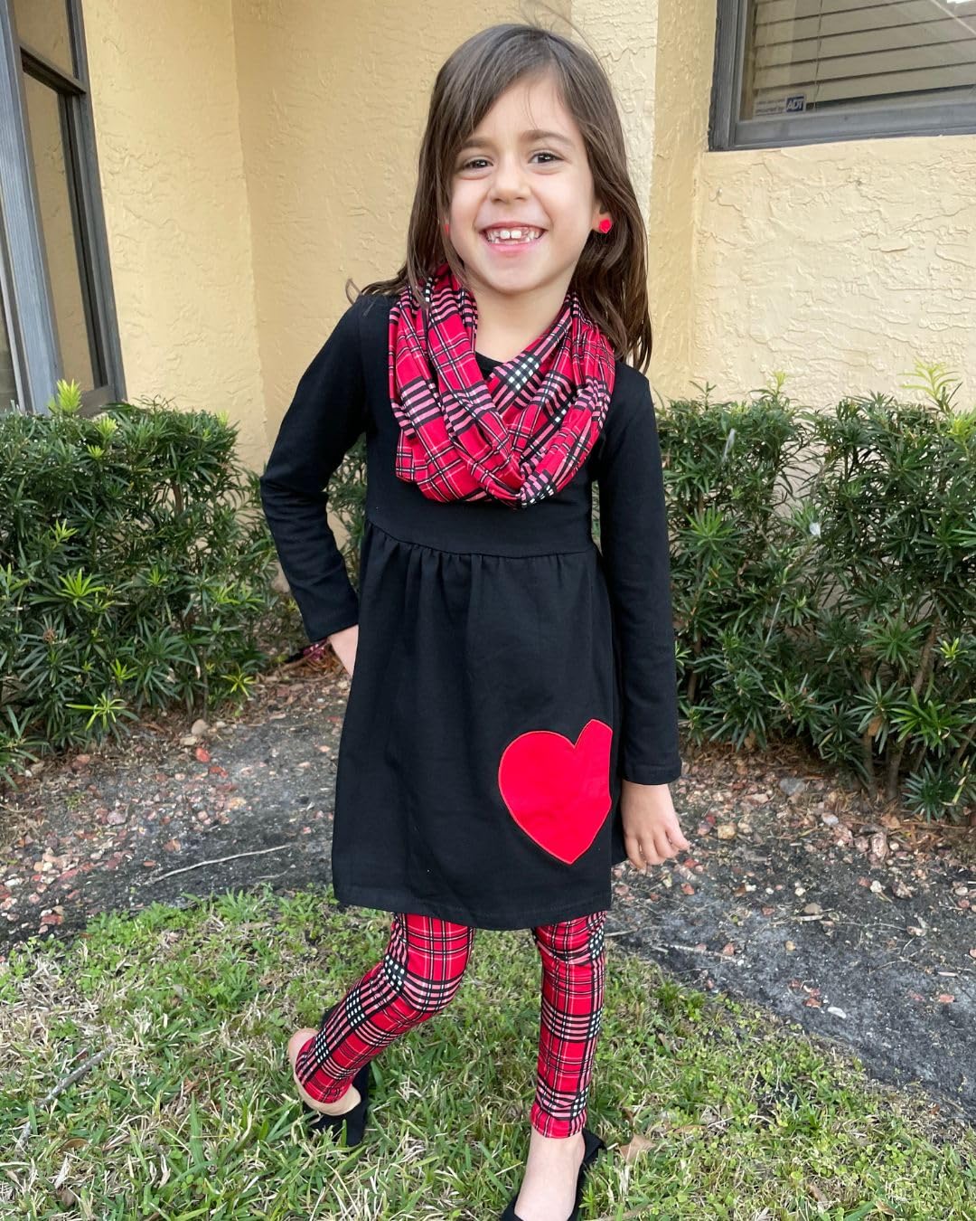 • STYLE [V-DAY PLAID]: Red colors bring out the Valentine's Day spirit in this adorable 3 piece legging set. The repeating plaid pattern on the leggings and scarf make this one is an eye catcher for sure and the heart applique on the top is adorable!