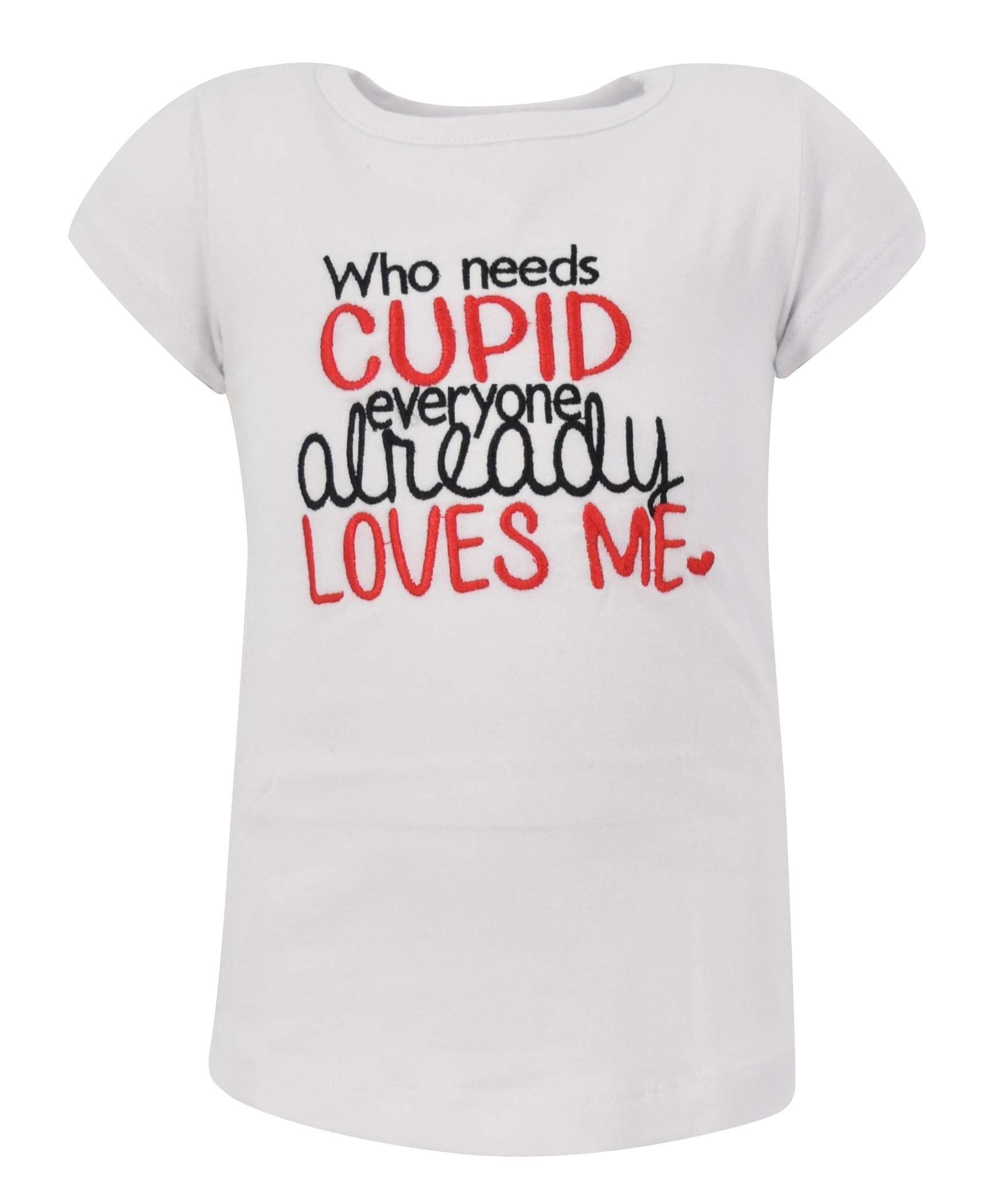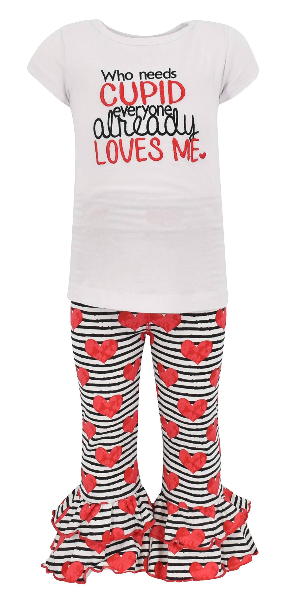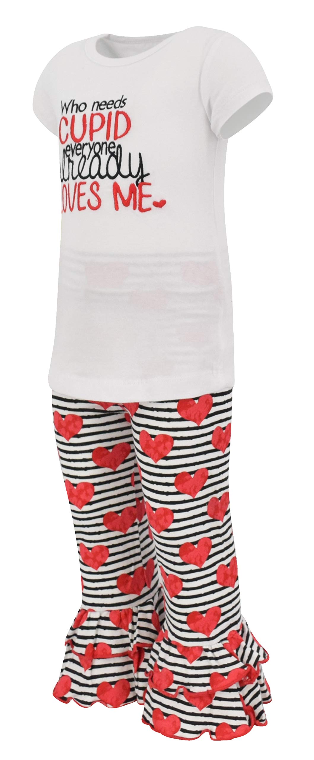 Details: Perfect for this Valentine's Day, these outfits are part of our limited edition Unique Baby holiday collection. Made in Egypt with high quality, soft Egyptian fabrics; this adorable Valentine?s Day outfit includes a red top with a hilarious applique that says, ?Who needs cupid? Everybody already loves me!?. The top is accompanied by a pair of double ruffled bottom leggings with a striped, watercolor hearts print. This outfit is sure to get lots of laughs this Valentine?s Day! Made of 95% Egyptian cotton and 5% lycra, this outfit is available in sizes 2-8 years.