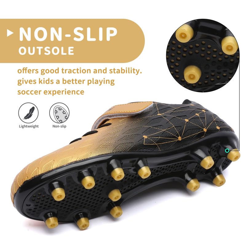 • Strong Outsole For Youth Soccer Cleats: Our outdoor & indoor soccer shoes flexible rubber outsoles and feature rugged studs to aid with traction on turf and outdoor fields, gives kids a better playing soccer experience.