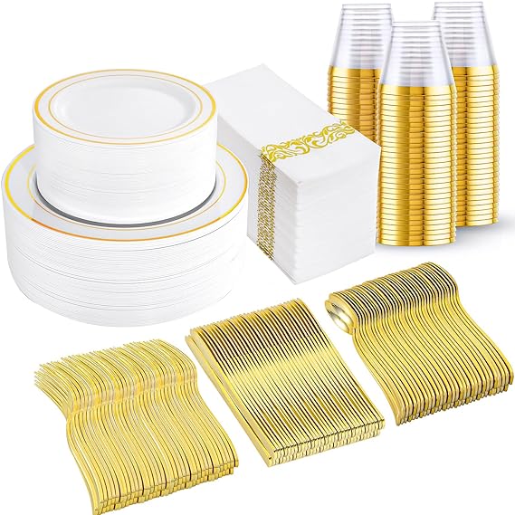 350 Pcs Gold Dinnerware Set, Plastic Plates Disposable for 50 Guests Include:50 Gold Rim Dinner Plates, 50 Gold Dessert Plates, 50 Paper Napkins, 50 Cups, 50 Gold Silverware Set Perfect for Party