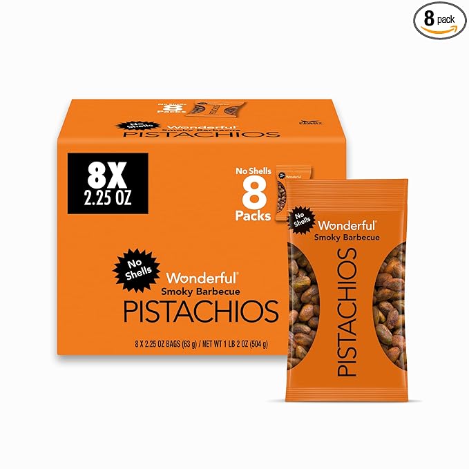 Wonderful Pistachios No Shells, Smoky Barbeque Nuts, 2.25 Ounce Bag (Pack of 8), Protein Snacks, Healthy Snack, Travel Snacks