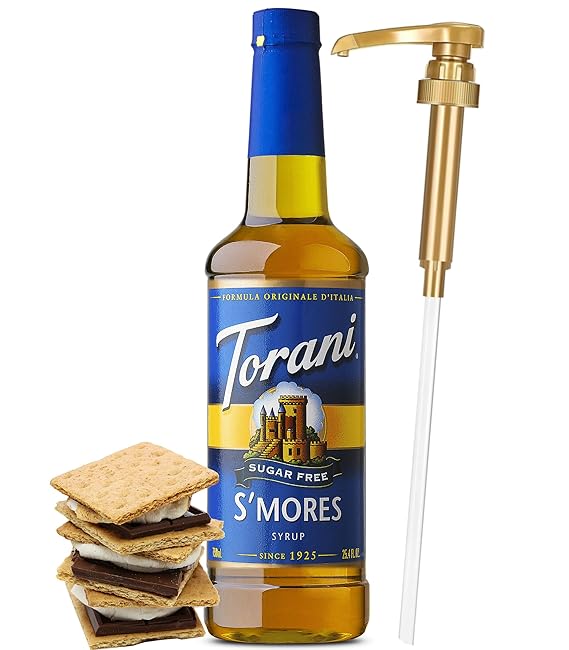 Torani Sugar Free Smores Syrup for Coffee with Little Squirt Syrup Pump, 750ml 25.4 Ounces