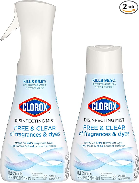 Clorox Free & Clear Disinfecting Mist, Household Essentials, 1 Spray Bottle and 1 Refill, 14 Fl Oz Each