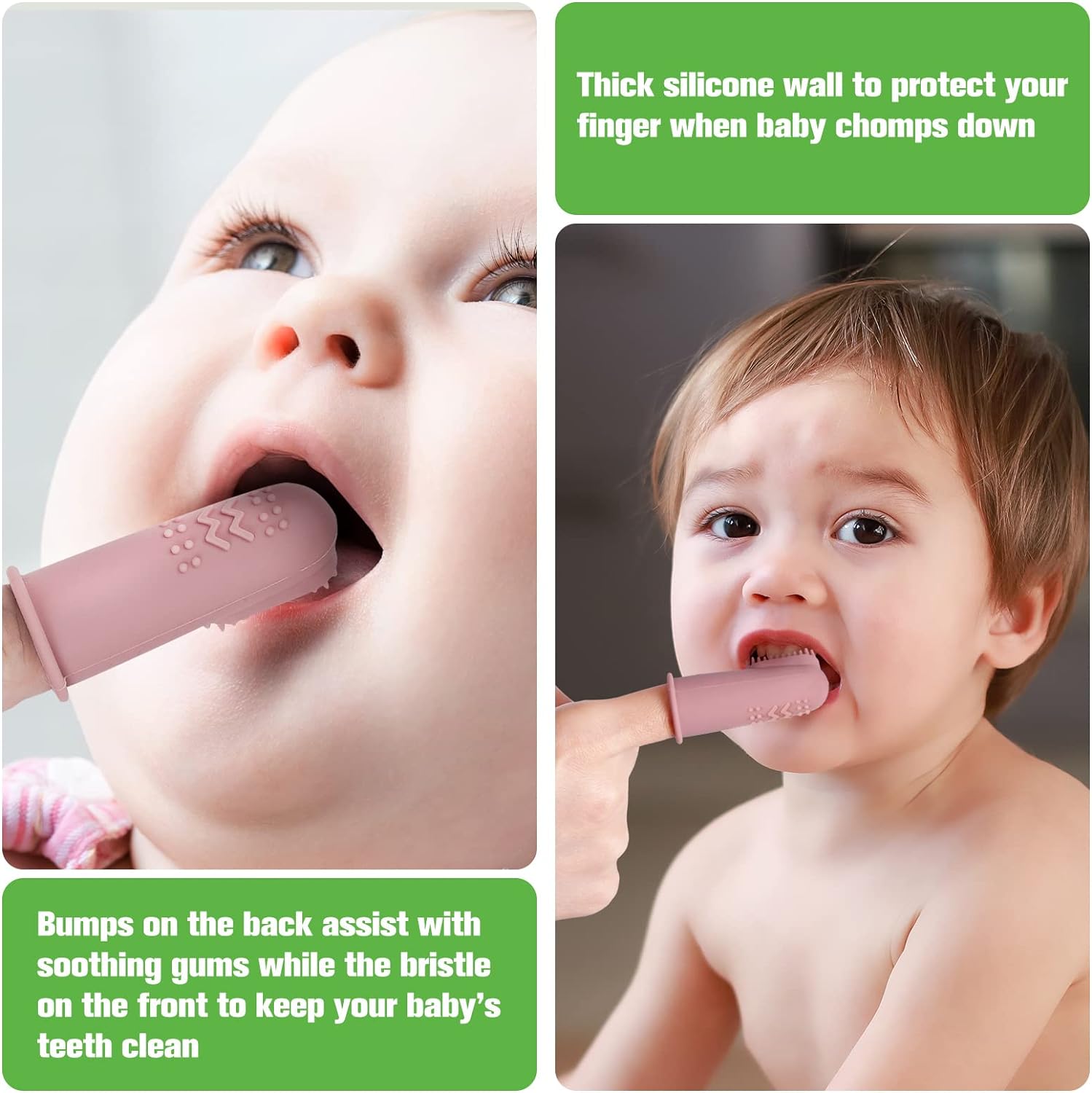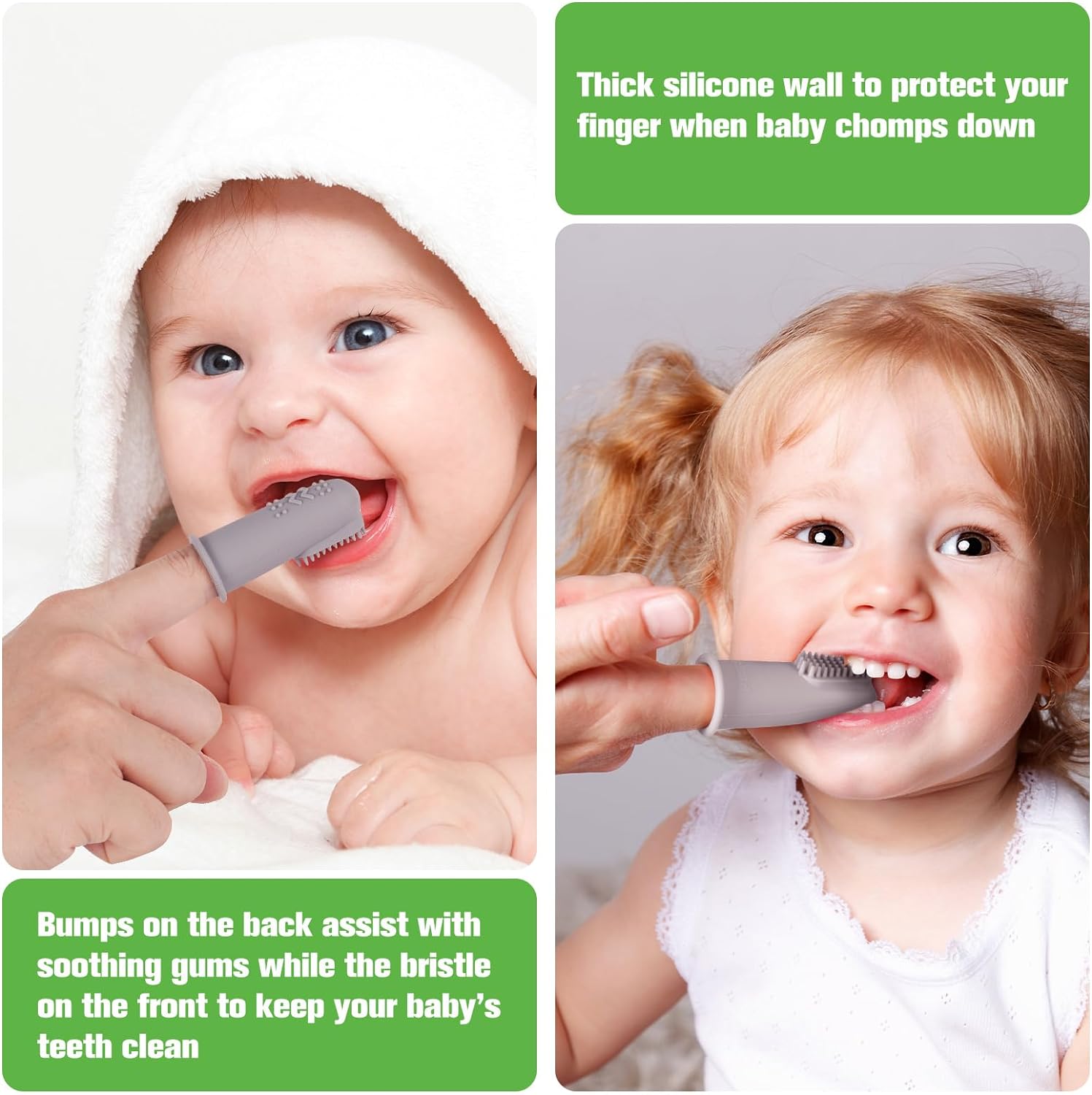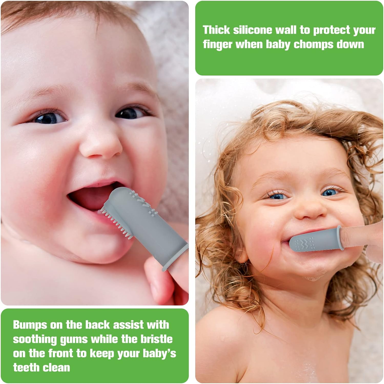 • 【FUNCTION】-Good Habit Forming: Helps train and develop good oral hygiene habits for babies and infants. Thick silicone wall to protect your finger when baby chomps down.