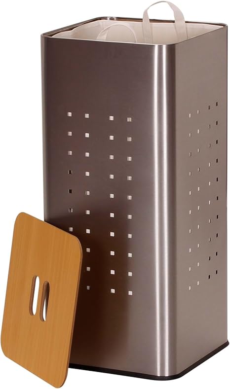 Household Essentials 7080-1 Square Metal Laundry Hamper -Removable Liner Bag and Wood Lid - Stainless Steel