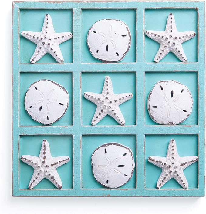 NIKKY HOME Beach Tic Tac Toe for Fun Starfish Sand Dollar Coastal House Coffee Table Decor Wood Board Travel Game, 8.98 x 8.98 x 1.18 inch, Teal
