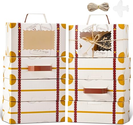 YODYZJ 20-Piece Mini Suitcase Party Favor Boxes with Window, 6.55 x 3.85 x 2.45 inches Candy Gift Boxes for Birthday, Travel Theme Decor and Wedding, Cookie Packaging (Brown, Small)