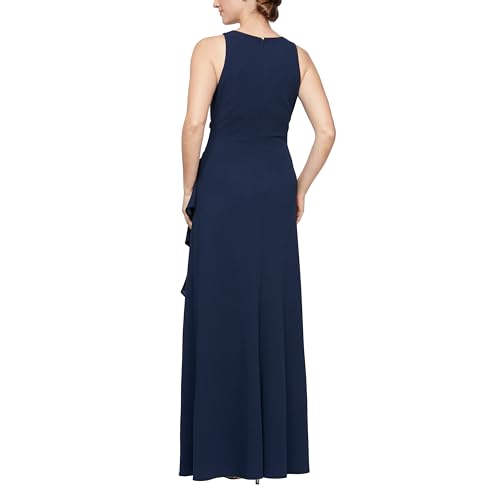 Details: Long Sleeveless Crepe Dress With Cascade Ruffle Skirt Detail and Cutaway Neckline.