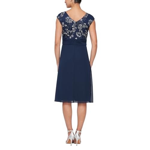 Alex Evenings Women's Short Sleeveless A-Line Dress with Embroidered Empire Bodice, Nacy/Silver Embroidery