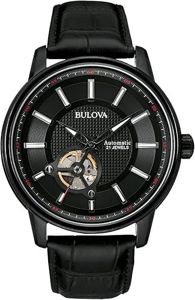 Bulova Men's Automatic Leather Watch, 21 Jewels, Hack Feature, Luminous Hands/Markers, Open Aperture, 45mm