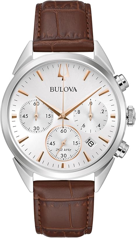 Bulova Men's Classic Sutton 6-Hand Chronograph High Performance Quartz Stainless Steel Case Watch with Brown Leather Strap, Silver-White Dial, 41.5mm Style:96B370