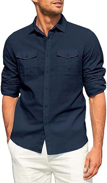 Button Down Shirt Men Cotton Linen Long Sleeve Tee Shirts Casual Oxford Textured Dress Shirts with Pockets