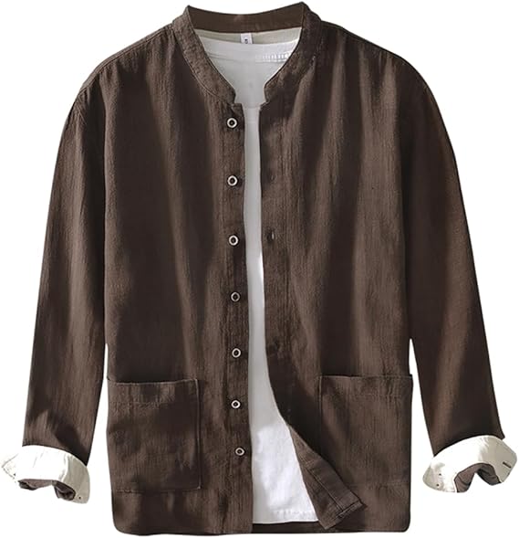 Long Sleeve Linen Shirt Men Stand Collar Breathable Shirt Casual Button Down Shirt Top