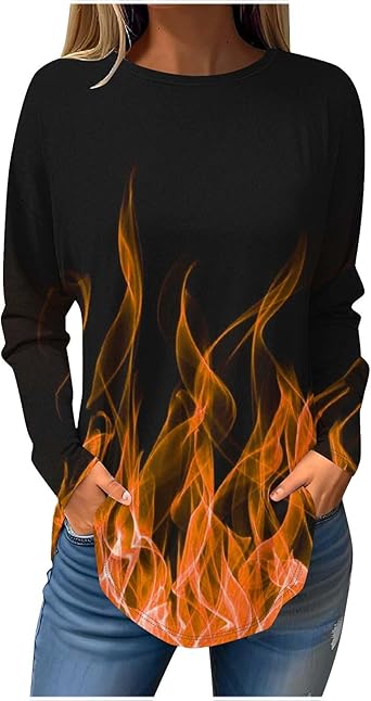 Long Sleeve Shirts for Women Crewneck Pullover Tops Casual Trendy Fire Print Tees Loose Blouse Flame Graphic Tshirts