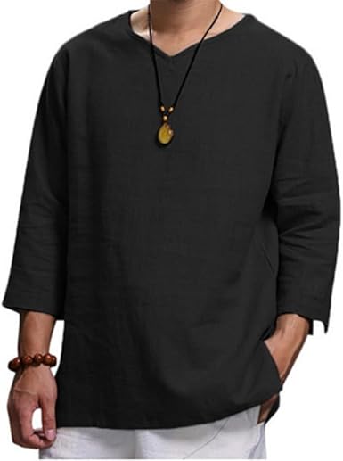 Men Cotton Linen Shirts Hippie Baggy Breathable 3/4 Sleeve Blouse Summer Casual Crewneck Beach Tunic Tops