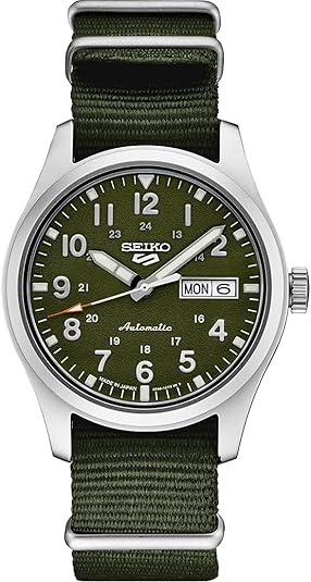 SEIKO SRPG33 Watch for Men - 5 Sports - Automatic with Manual Winding Movement, Green Dial, Stainless Steel Case, Green Nylon Strap, 100m Water Resistant, and Day/Date Display