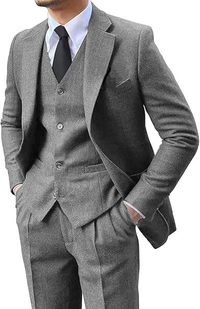 Men's 3 Pieces Suit Retro Slim Fit Suit Tweed Herringbone Business Suit Wedding Party Tuxedos with Blazer Vest Pants