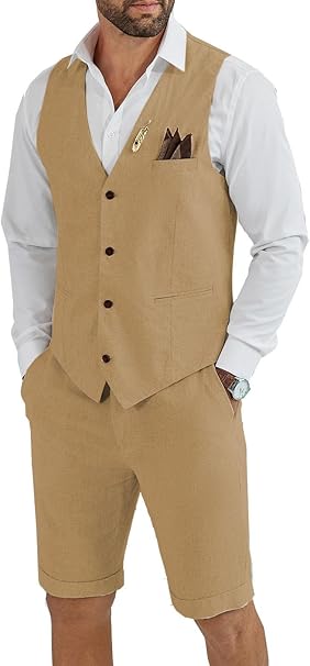 Men's Linen 2 Piece Suit Slim Fit Wedding Groom Groomsmen Summer Vest Shorts Set
