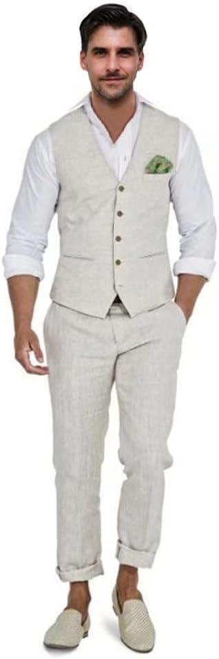 Men's Linen Suits 2 Piece Slim Fit Suit Prom Beach Wedding Groomsman Vest Pants Set Casual Summer Linen Outfit